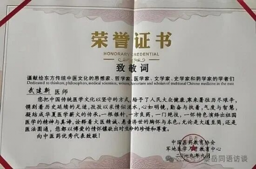 良医处世,不矜名,不记利,此其立德,此其立功也。武老师于这功在当代利在千秋的中医传承行业中,从无怨言,不追名,不逐利。凡事都致力于做到尽善尽美,医所痊愈。武老师以“大医精诚”为格言,不断精益求精,将“传统中医文化开枝散叶满华夏”的愿景早日实现,也相信越来越多仁心博爱的年轻人和有志之士能以此为旗帜和榜样,在同一片蓝天和同一面旗帜下,传承好中国传统医术,惠万家幸福,助祖国强盛