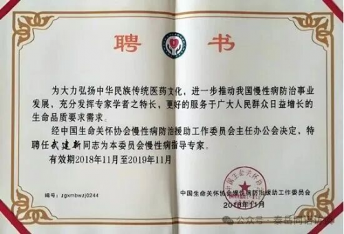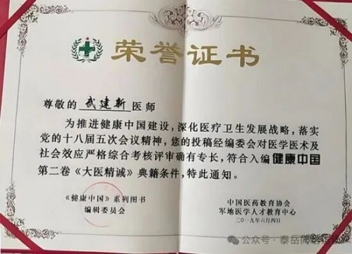 2007年3月22日正式编入国际医疗编委会,并在国际医疗临床协作网站中收录和表彰,中国医师网(收录为健康专家,增选武建新为中国国际专业人,才发展研究中心行业,特邀高级人才。授予全国首批优秀人才模范勋章,同年经专家委评审通过,已载入《国际医疗临床协作博览》,同时颁发《国际医学特色诊疗专家》荣誉金牌、中华医学会“中华名医”并荣获勋章。
