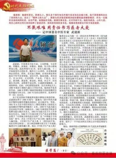 医者仁心,历史会记住武建新为百姓的幸福和中医药事业传承所做出的贡献。医德如碑,责任如山他的济世情怀诠释着奉献价值的真谛。愿他用爱铸就的事业造福更多的人!成武院长将继续禀程着“仁术慈心,修身济众”的神圣天职,心怀赤诚,孜孜不倦,愿在有生之年,为弘扬中华中医文化贡献力量。