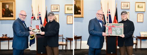(菲利普·马顿和周鲁浩在阿德莱德市政厅互换礼物)